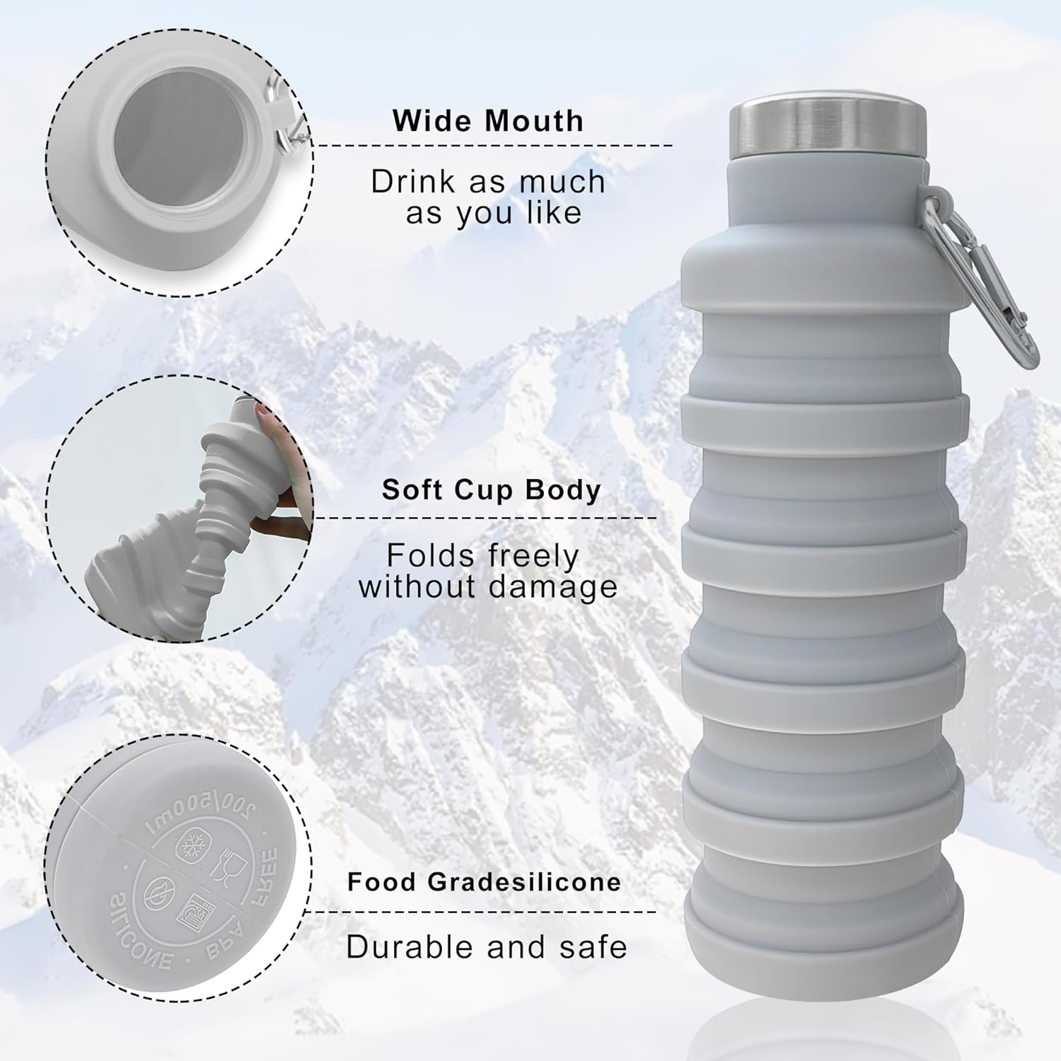 Crafted from high-quality silicone, this reusable water bottle is durable and eco-friendly, helping you reduce single-use plastic waste. Its collapsible design allows you to easily fold and store the bottle when not in use, saving space in your bag or backpack. The leak-proof lid ensures a secure seal, preventing any spills or leaks during your activities.